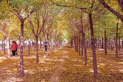 10月26日,記者路過大荔縣許莊一片50多畝的銀杏林時,發(fā)現(xiàn)了這個當?shù)赜忻摹熬W紅地”。金黃色的銀杏葉鋪滿大地,為厚重的黃土穿上了艷麗的“黃金甲”。