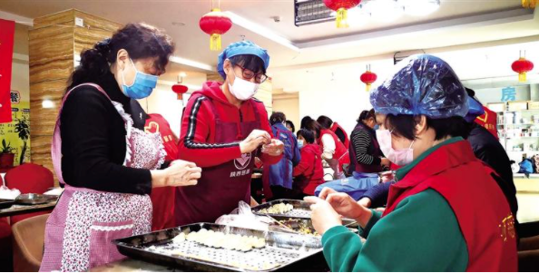 丁水彬孝老愛親志愿者服務(wù)隊(duì)隊(duì)員在西安碑林第三愛心護(hù)理院為老人包餃子。