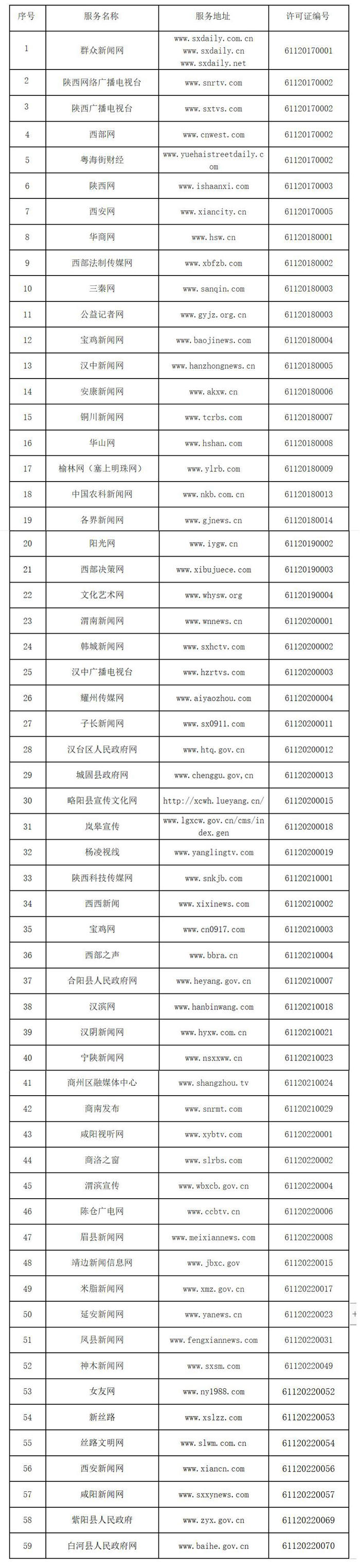 《互聯(lián)網(wǎng)新聞信息服務(wù)管理規(guī)定》實(shí)施以來(lái),陜西省網(wǎng)信辦按照國(guó)家互聯(lián)網(wǎng)信息辦公室統(tǒng)一工作部署,組織開(kāi)展屬地互聯(lián)網(wǎng)新聞信息服務(wù)許可審批工作,F(xiàn)將陜西省互聯(lián)網(wǎng)新聞信息服務(wù)單位相關(guān)許可信息予以公開(kāi),包括:服務(wù)主體136個(gè),互聯(lián)網(wǎng)站59個(gè),應(yīng)用程序130個(gè),論壇2個(gè),公眾賬號(hào)299個(gè),共計(jì)490個(gè)服務(wù)項(xiàng)。