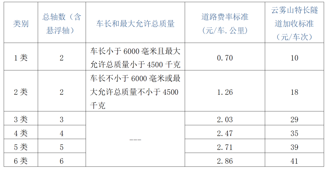 除國家規(guī)定免繳通行費的車輛外,其他車輛均須按照《收費公路車輛通行費車型分類》(JT/T489-2019)及下列收費標(biāo)準(zhǔn)繳納車輛通行費。