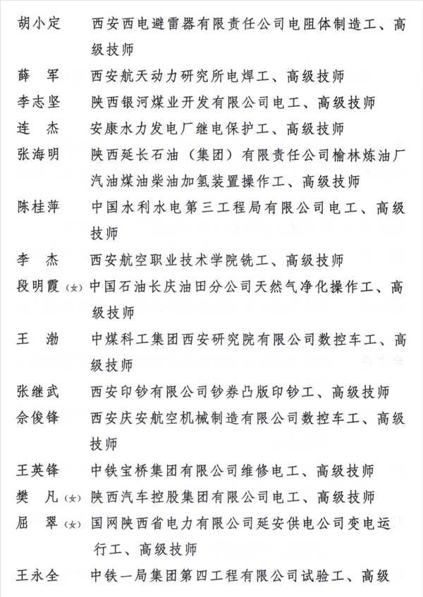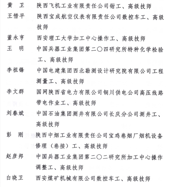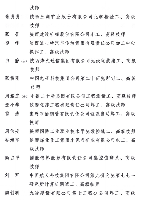 2022年“三秦工匠”稱(chēng)號(hào)獲得者名單