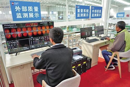 陜西洛川一蘋(píng)果企業(yè)車(chē)間內(nèi),工作人員通過(guò)智能選果控制系統(tǒng)監(jiān)測(cè)分選線上蘋(píng)果的外觀以及糖度、糖酸比。 新華社記者 邵 瑞攝 “霜降一過(guò),上樹(shù)摘果”。初冬到來(lái),……