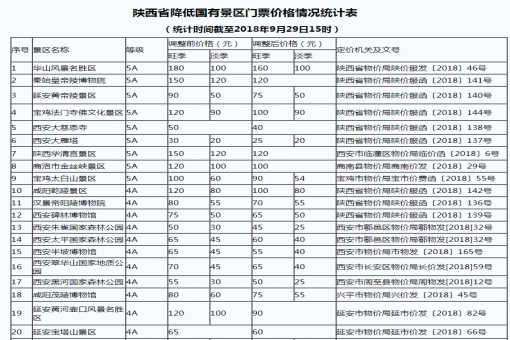 記者9月29日從陜西省物價局官方網(wǎng)站了解到,“十一”黃金周前夕,陜西省秦始皇帝陵博物院、華清宮、法門寺、黃帝陵、大雁塔、大慈恩寺、乾陵、漢陽陵、西安碑林……