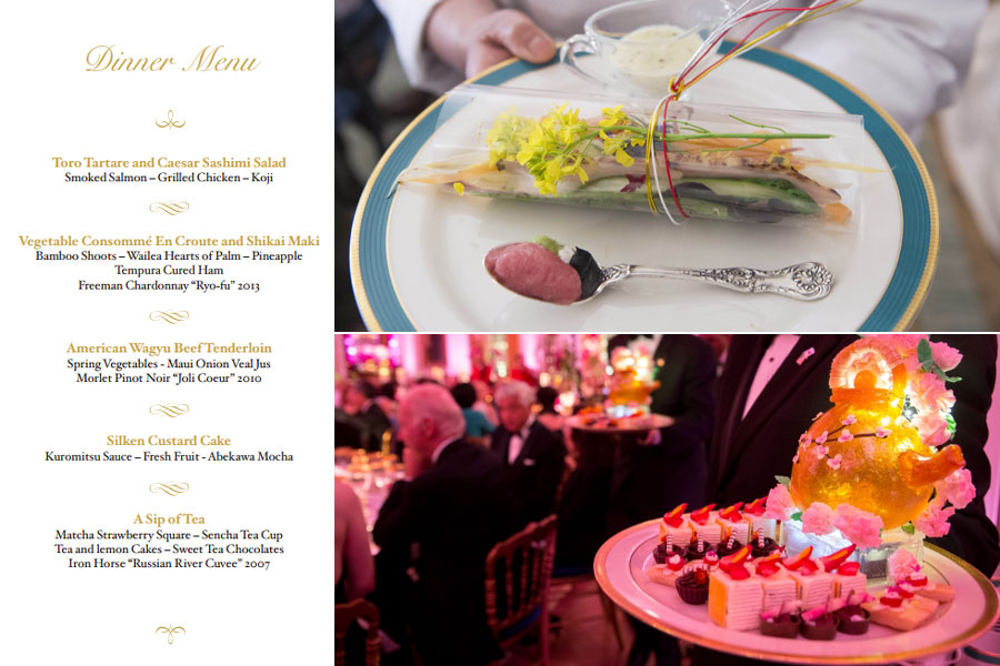 2015年4月28日,美國(guó)總統(tǒng)奧巴馬在白宮宴請(qǐng)日本首相安倍晉三,數(shù)百名賓客享用融合美日兩國(guó)特色的美食。國(guó)宴菜品在傳統(tǒng)西餐搭配的基礎(chǔ)上加入了日本元素,包括生魚(yú)片、和牛牛排、日本麻糬等,還有用白宮菜園里摘取的蔬菜所制成的沙拉,用豆腐和豆奶制成的奶酪蛋糕,以及白宮廚師特別用糖制作的櫻花茶壺!