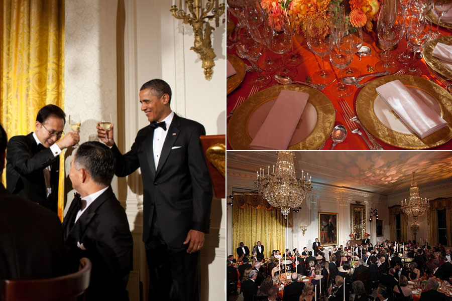 美國白宮2011年10月13日迎來了韓國總統(tǒng)李明博的訪問。當(dāng)天晚上,奧巴馬設(shè)國宴款待李明博。白宮官網(wǎng)在介紹國宴菜品時說,當(dāng)晚的菜品是當(dāng)?shù)刈詈玫氖巢暮晚n國傳統(tǒng)風(fēng)味結(jié)合的成果。