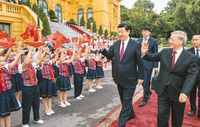 | 11月12日,中共中央總書記、國家主席習(xí)近平在河內(nèi)越共中央駐地同越共中央總書記阮富仲舉行會(huì)談。圖為會(huì)談前,阮富仲在主席府廣場為習(xí)近平舉行盛大歡迎儀式。 |