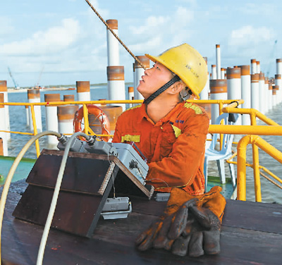| 7月30日,在肯尼亞拉穆港,工作人員在中國交建“粵工樁11號”施工船上工作。 |