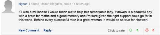 英國倫敦的網(wǎng)友bigben表示:“如果我能再有錢一些的話,我一定會幫助這位偉大的女士的。蔣昊文是個非常聰明的孩子,擅長數(shù)學,過目不忘。他如果能夠有更多的幫助,必定能在世上有所作為。常言說,‘每個成功的男人背后都有個偉大的女人’,昊文背后偉大的女人就是他的奶奶。”