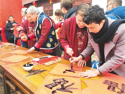 | 國(guó)際友人在學(xué)寫“福”字。 |