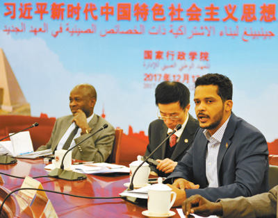 習(xí)近平新時代中國特色社會主義思想、人類命運(yùn)共同體、反腐斗爭、精準(zhǔn)扶貧、“一帶一路”……2017年歲末,20位蘇丹政府部級官員來到中國參加國家行政學(xué)院的培訓(xùn)交流。黨的十九大規(guī)劃了中國從現(xiàn)在到本世紀(jì)中葉的發(fā)展藍(lán)圖,宣示了中方愿同各方推動構(gòu)建人類命運(yùn)共同體的真誠愿望。蘇丹政府決策者們希望更加深入地理解中國和中國共產(chǎn)黨,學(xué)習(xí)借鑒中國經(jīng)驗(yàn)和中國智慧,解讀中國共產(chǎn)黨的“執(zhí)政密碼”