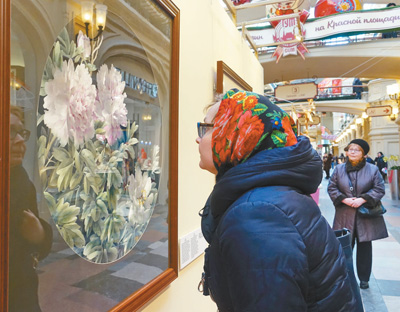 | 春節(jié)期間,在古姆百貨展出的中國刺繡作品吸引了不少莫斯科市民參觀。 |