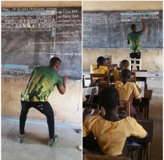 據(jù)英國《每日郵報(bào)》3月1日報(bào)道,近日,一位加納中學(xué)老師在臉書上分享的“獨(dú)門”教學(xué)照片帖子走紅網(wǎng)絡(luò)。據(jù)悉,由于他所任教的中學(xué)沒有電腦設(shè)備,所以他只能使用彩色粉筆不辭辛苦地將電腦屏幕的一個(gè)個(gè)頁面繪制到黑板上進(jìn)行教學(xué)。他給學(xué)生在黑板上畫圖講解如何使用微軟Word的照片發(fā)出后,這位老師獲得了全球的贊譽(yù)。GiA安康新聞網(wǎng)
