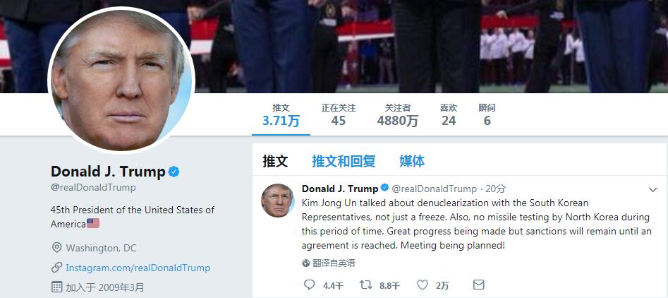 特朗普隨后發(fā)推特說(shuō),朝鮮領(lǐng)導(dǎo)人金正恩向韓國(guó)特使團(tuán)表達(dá)了無(wú)核化意愿,不只是凍結(jié)核試驗(yàn),并表示愿意停止導(dǎo)彈試驗(yàn),“開始計(jì)劃會(huì)晤”。