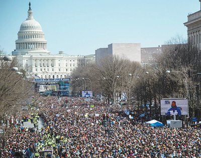 3月24日,來(lái)自全美各地的近50萬(wàn)人涌入美國(guó)首都華盛頓,參加以“為了我們的生命”為主題的反對(duì)槍支暴力大游行。游行者呼吁美國(guó)政府采取更加嚴(yán)格的控槍措施,保護(hù)校園安全,同時(shí)要求政客們不再接受美國(guó)全國(guó)步槍協(xié)會(huì)等團(tuán)體的政治獻(xiàn)金。這一天,從紐約、波士頓、洛杉磯,再到上月發(fā)生校園槍擊案的佛羅里達(dá)州帕克蘭,同一主題的大游行在全美390多個(gè)城市同步舉行。美國(guó)民眾尤其是青少年學(xué)生紛紛走上街頭,響亮地發(fā)出他們的聲音:“面對(duì)槍支暴力,我們不再沉默,政客們必須在控槍問題上有所作為!