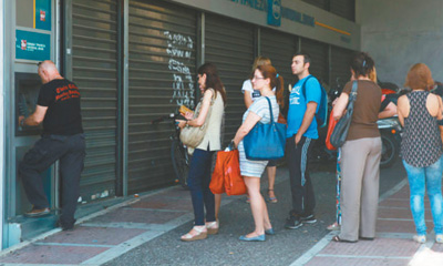 | 希臘債務(wù)危機(jī)于2015年大選后急劇惡化,引發(fā)國(guó)內(nèi)擠兌“狂潮”。圖為2015年7月2日,雅典民眾在取款機(jī)前排隊(duì)取錢。 |