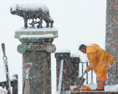 | 由于當(dāng)?shù)卣姓书L(zhǎng)期低下難解,經(jīng)常讓意大利首都羅馬等地因大雪等突發(fā)狀況陷入“癱瘓”。圖為2018年2月26日,一名清潔工在羅馬市政府外清除積雪。 |