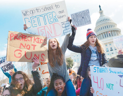 | 主張槍支自由的利益團(tuán)體在美國(guó)選舉政治中舉足輕重,特朗普政府依舊囿于利益對(duì)控槍態(tài)度曖昧引發(fā)民眾不滿。圖為2018年3月14日,美國(guó)學(xué)生在華盛頓游行呼吁加強(qiáng)對(duì)槍支管控。 |