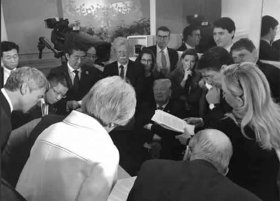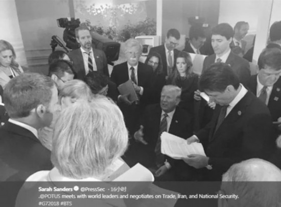 七國(guó)各有盤算,各說各話,互不相讓,明爭(zhēng)暗斗。峰會(huì)結(jié)束不久,各國(guó)政府又開啟了“斗圖”模式。同一場(chǎng)景,不同角度的照片,似乎告訴外界不同的故事。