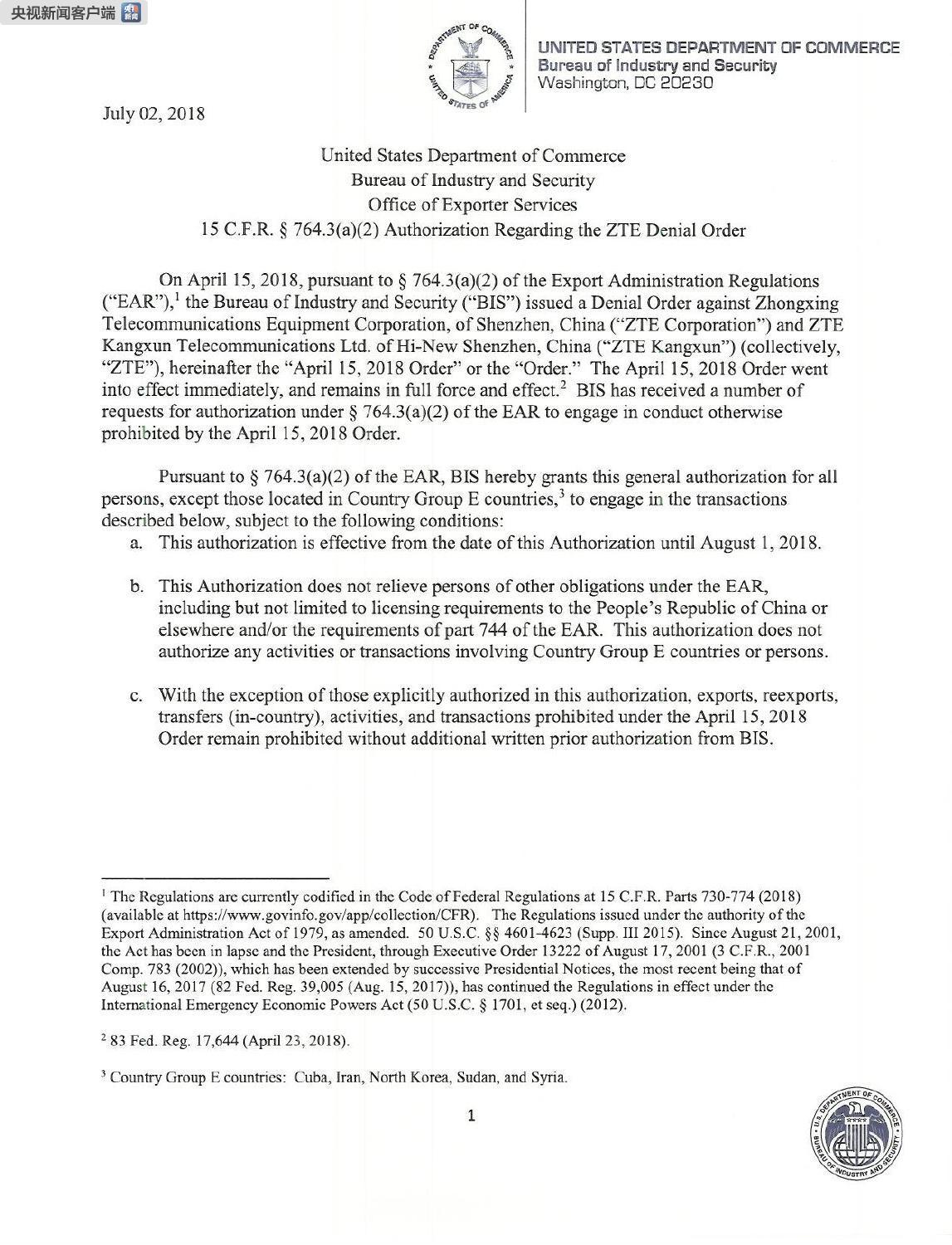 美國東部時間7月2日,美國商務(wù)部發(fā)布公告,暫時、部分解除對中興通訊公司的出口禁售令。