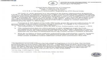 美國(guó)東部時(shí)間7月2日,美國(guó)商務(wù)部發(fā)布公告,暫時(shí)、部分解除對(duì)中興通訊公司的出口禁售令。 公告稱:從公告發(fā)布之日起至8月1日,在有限條件下解除……