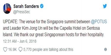 人民網(wǎng)北京6月6日電(姚麗娟) 美國總統(tǒng)特朗普與朝鮮最高領(lǐng)導(dǎo)人金正恩的首次會面將于6月12日在新加坡舉行。美國白宮5日公布了美朝領(lǐng)導(dǎo)人會晤的……