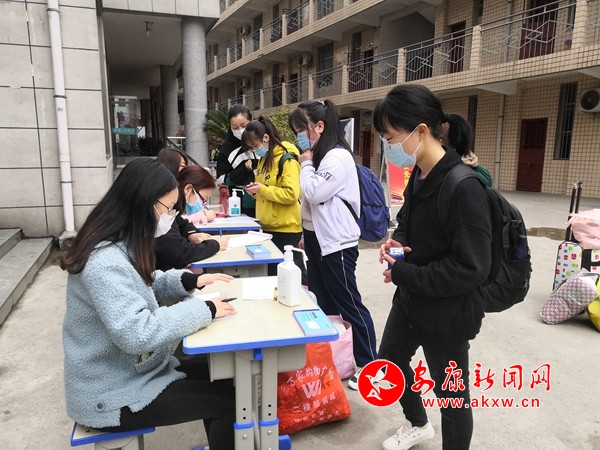 本網(wǎng)訊(通訊員 趙軍 張濤)今天是3月30日,也是陜西省教育廳規(guī)定高三開學(xué)復(fù)課的日子,老師和同學(xué)們?cè)俅蜗嗑,全力以赴?fù)課備考,從早七點(diǎn)多開始,安康城區(qū)漢濱高中的高三學(xué)生們陸續(xù)入校,大家不約而同全程佩戴口罩,在老師指引下,有序通過紅外測(cè)溫儀,并用酒精對(duì)全身和行李進(jìn)行消毒。