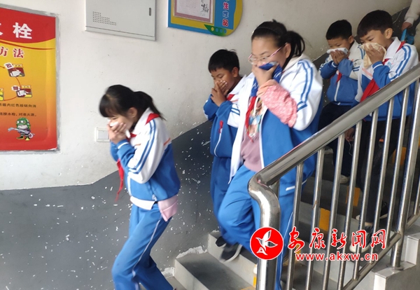 演練中,全校500多名學(xué)生在各班老師的指引下,捂住口鼻,彎著身體、快速有序地按照既定的逃生路線,撤離到學(xué)校操場,從警報聲響起到最后一名學(xué)生撤離到操場,僅用時1分30秒。