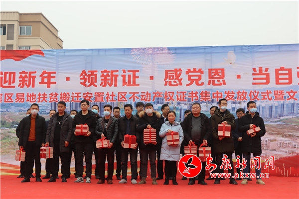 本網(wǎng)訊(通訊員 唐海龍 王林)“迎新年、領新證,感黨恩、當自強。”歌舞歡騰、喜氣洋洋的漢濱區(qū)建民辦長嶺社區(qū)活動廣場上,搬遷戶張善武拿著鮮紅的不動產權證書激動地說:“領到新本本,心里一下踏實多了,日子更有盼頭了!”。