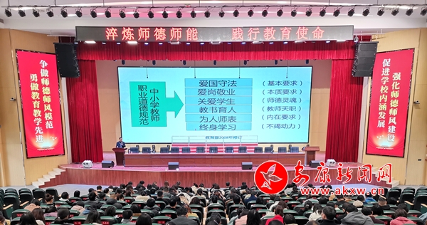 本網(wǎng)訊(通訊員 李晴)11月21日,漢濱初中高新校區(qū)邀請(qǐng)安康市教研室副主任、陜西省教學(xué)能手、陜西省學(xué)科帶頭人、陜西省名師工作室主持人吳萬強(qiáng)老師為全校教師進(jìn)行師德師風(fēng)專題講座。