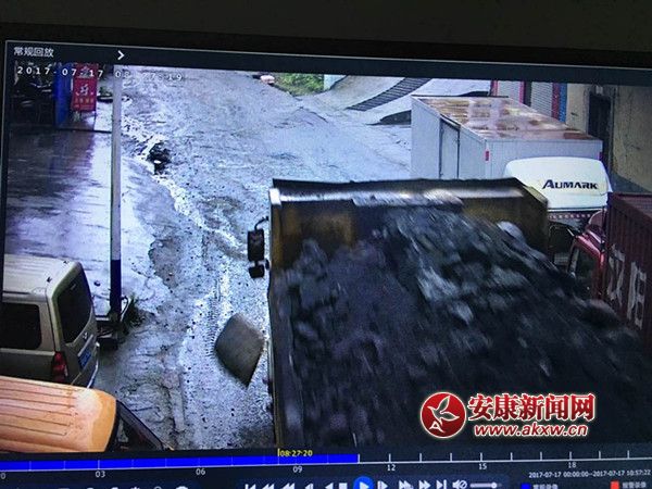 上午8時(shí)許,漢陽派出所接到群眾張某報(bào)警稱自己停放在路邊的輕卡被路過的渣土車上掉落的石頭砸了,請求出警。民警到達(dá)現(xiàn)場發(fā)現(xiàn)渣土車停放在輕卡十余米前,裝滿土石料,最高處高于車廂擋板三四十厘米,并且也沒有遮蓋。民警通過視頻監(jiān)控系統(tǒng)發(fā)現(xiàn)是渣土車經(jīng)過時(shí)因?yàn)榈缆凡黄,堆放的石塊滾落將停放在路邊的輕卡的引擎蓋砸了一個(gè)大坑。