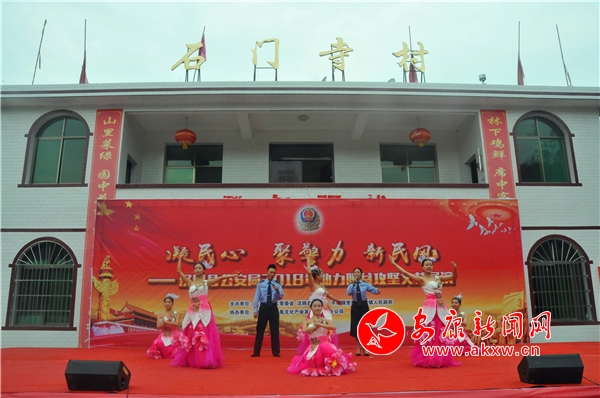活動(dòng)對(duì)石門寺村涌現(xiàn)出的3名優(yōu)秀共產(chǎn)黨員、3名脫貧攻堅(jiān)自強(qiáng)標(biāo)兵、3名文明衛(wèi)生示范戶、2名好婆婆和2名好媳婦進(jìn)行了表彰。活動(dòng)文藝節(jié)目演出在舞蹈《盛世歡歌》中拉開(kāi)序幕,巡特警大隊(duì)民警表演的《擒敵拳》《硬氣功》,虎虎生威、技驚四座,讓群眾見(jiàn)證了漢陰公安維護(hù)平安的本領(lǐng)和力量;交警大隊(duì)表演的《交警指揮手勢(shì)操》整齊劃一,既向群眾宣傳了交通安全知識(shí),又體現(xiàn)了交警規(guī)范執(zhí)法執(zhí)勤水平;在《警犬演練》中,警犬歐巴、華仔登場(chǎng),分別進(jìn)行了服從、搜毒、反暴恐等科目表演,展現(xiàn)了漢陰公安警犬中隊(duì)從無(wú)到有、從有到精的變化;巡特警大隊(duì)民警劉鵬表演的獨(dú)唱《父親》和城關(guān)派出所民警表演的三句半《警民共奏扶貧曲》情感豐富、寓教于樂(lè),深受群眾喜愛(ài);歌舞《陜南民歌聯(lián)唱》和《漢陰,我可愛(ài)的家鄉(xiāng)》,歌聲悠揚(yáng)、舞姿優(yōu)美,贏得現(xiàn)場(chǎng)觀眾陣陣掌聲。