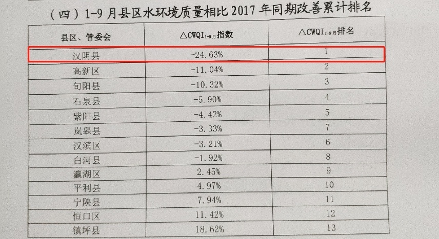 據(jù)安康市三季度環(huán)境質(zhì)量通報,該縣2018年1至9月主要河流漢江漢陰段水質(zhì)持續(xù)保持為地表水二類,月河漢陰段從地表水三類提升為二類,為縣域環(huán)境質(zhì)量提升補齊了短板。