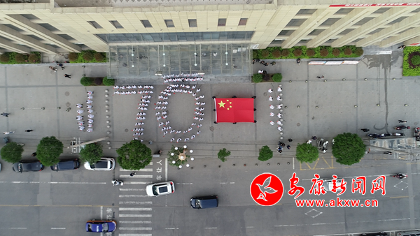 當日8點20,一名醫(yī)生從科室中取出手風琴,來到大廳中開始演奏。隨著樂曲響起,一位位手持小紅旗、胸嵌黨徽的醫(yī)護人員從人群中走出,他們或面對周圍觀眾,或互相對望,深情動人的歌聲讓現(xiàn)場觀眾備受感染,吸引越來越多的患者和路人駐足觀望。隨后,他們走出大廳,來到醫(yī)院門口,在這里,數百名醫(yī)護人員在歌聲中匯聚,一側高舉國旗,一側形成方陣,大家揮動著手中的小紅旗,一齊高聲歌唱著《我和我的祖國》。在清晨陽光的照射下,鮮艷的五星紅旗和“70”方隊格外醒目,大家齊聲高唱,歌聲經久不息,令人熱血澎湃、催人奮進。