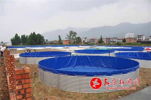 在項目建設(shè)現(xiàn)場,60個直徑8米高1.5米的圓形水池已經(jīng)建好,一個個用鐵皮圍成的藍色圓桶很是顯眼。“這種水池外圈都是由不銹鋼圍成的,里面是用藍色防水布包裹。”劉光興指著水池說:“這個鄉(xiāng)村振興項目是陸基圓桶型高位養(yǎng)魚池,主要利用洞河水庫庫區(qū)下游優(yōu)質(zhì)水資源來養(yǎng)殖匙吻鱘、黃辣丁、鱸魚等中高端暢銷品種。采取的是循環(huán)水養(yǎng)魚新模式,優(yōu)勢是流水養(yǎng)魚、品質(zhì)好,還減少了人力和養(yǎng)殖成本,提高科學化管理水平。6月底前,就能建成使用。”