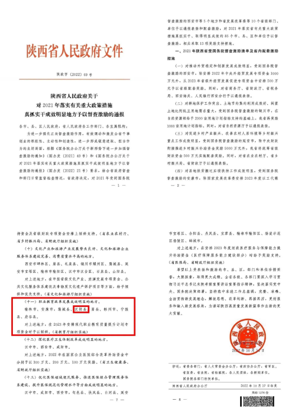 從陜西省人民政府文件《陜西省人民政府關(guān)于對2021年落實(shí)有關(guān)重大政策措施真抓實(shí)干成效明顯地方予以督查激勵(lì)的通報(bào)》(陜政字[2022]69號(hào))獲悉,漢陰縣獲評2021年度職業(yè)教育改革發(fā)展成效明顯縣。此次全省共六個(gè)縣區(qū)榮獲職業(yè)教育改革發(fā)展成效明顯縣,漢陰縣名列其中。陜西省教育廳將在2023年安排現(xiàn)代職業(yè)教育質(zhì)量提升計(jì)劃專項(xiàng)資金時(shí)對漢陰縣予以傾斜。