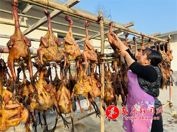 進入臘月,位于大山深處的鐵佛寺鎮(zhèn)共同村也熱鬧了起來,一大早,共同村經(jīng)濟合作社負責(zé)人章漢和工人們正忙著加工制作熏雞,據(jù)加工師傅曹承香介紹,熏雞是將在桑園地露天放養(yǎng)的土雞屠宰后,輔以農(nóng)家秘制佐料腌制,并進行晾曬、煙熏,制作出的熏雞色澤金黃、肉質(zhì)緊致、口感極佳。2021年開始,共同村合作社利用生態(tài)優(yōu)勢,以當(dāng)?shù)厣B(yǎng)土雞為原材料,用傳統(tǒng)的熏制臘味的工藝開始制作熏雞。f8L安康新聞網(wǎng)