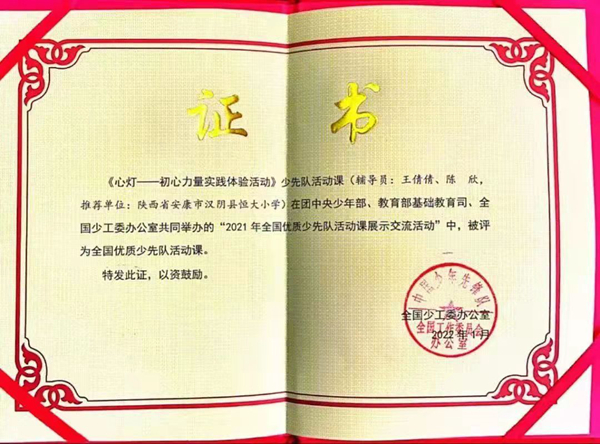 本網(wǎng)訊(通訊員 林愛銘)近日,共青團中央少年部、教育部基礎(chǔ)教育司、全國少工委辦公室公布“2021年全國優(yōu)質(zhì)少先隊活動課”名單。漢陰縣恒大小學選送的少先隊活動……