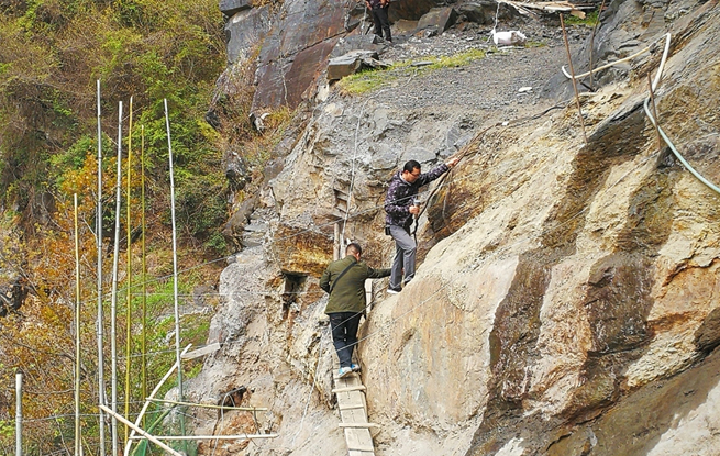 四五十米高的懸崖上,搭著兩條總寬不到30厘米的木板,這是漢陰縣鐵佛寺鎮(zhèn)合一村八組100多名村民出行的必經(jīng)之路,眼下正值春耕時(shí)節(jié),化肥種子運(yùn)不進(jìn)去,村民非常著……