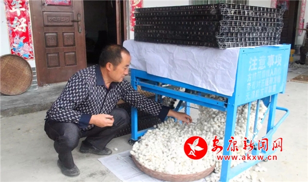 蔡明勇是迎豐鎮(zhèn)梧桐寺村的養(yǎng)蠶大戶,今年他養(yǎng)了六季20張蠶,純收入近3.8萬元。家中350多個紙質(zhì)方格簇和100個塑框木質(zhì)方格蔟都掛滿了雪白的蠶繭,看著喜人極了。蠶桑合作社將引進(jìn)的快速取繭機(jī)放在他家試點,在取蠶繭的時候,一方面測試取繭省勞節(jié)本的效益,一方面妙用快速取繭機(jī)進(jìn)行推廣。Adv安康新聞網(wǎng)