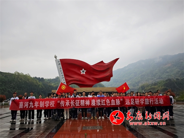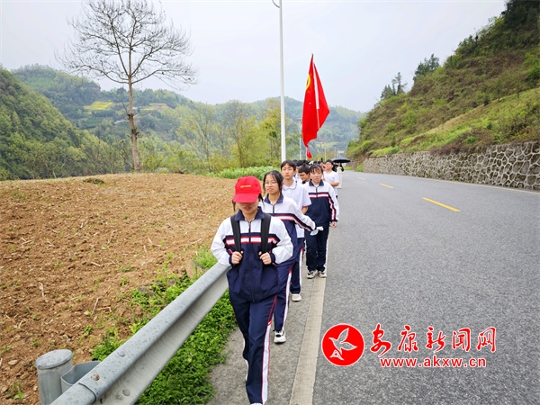 活動中,該校師生沿著公路有序行進,途中相互鼓勵打氣,順手撿走路邊垃圾,用實際行動保護家鄉(xiāng)的綠水青山,彰顯中學生良好的精神風貌。經過2個小時的徒步行走,師生順利到達終點喜河鎮(zhèn)紅色文化廣場。