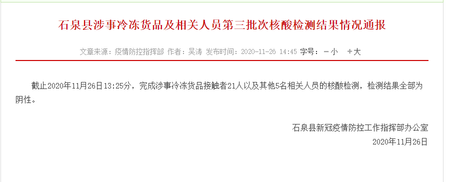 截止2020年11月26日13:25分,完成涉事冷凍貨品接觸者21人以及其他5名相關(guān)人員的核酸檢測(cè),檢測(cè)結(jié)果全部為陰性。Pyy安康新聞網(wǎng)