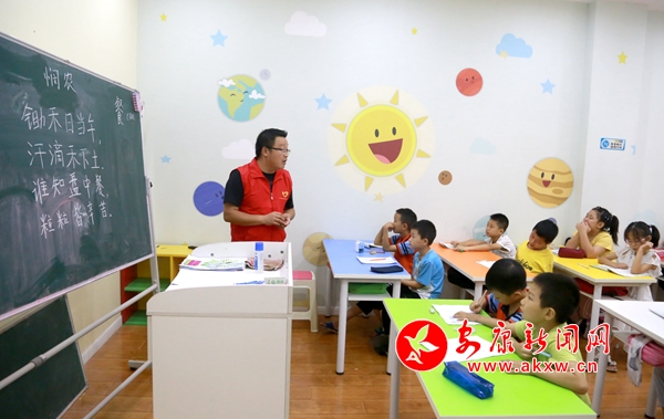 8月14日,石泉縣池河鎮(zhèn)西苑社區(qū)大學生志愿者正在為暑期免費輔導班學生講解《憫農(nóng)》,教育孩子們勤儉節(jié)約。孩子們通過講解父母或自己參與勞作的感受,體會了“汗滴……