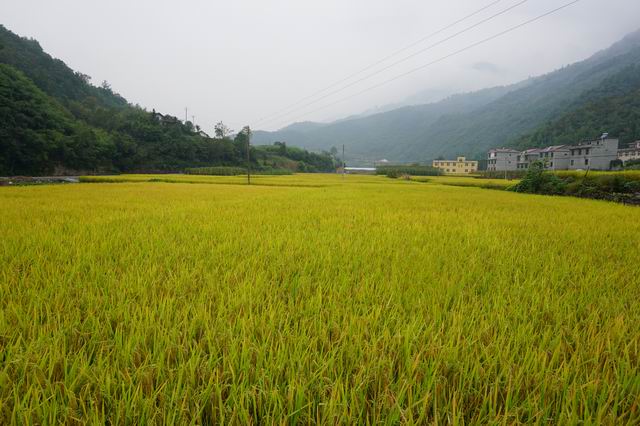 汽車順著一條蜿蜒曲直的水泥路,沿著西岔河逆流而上,疊嶂滴翠,肥鴨戲水,炊煙應景,四目張望一梯梯、一片片金黃的稻田,收獲之悅悠然心底。