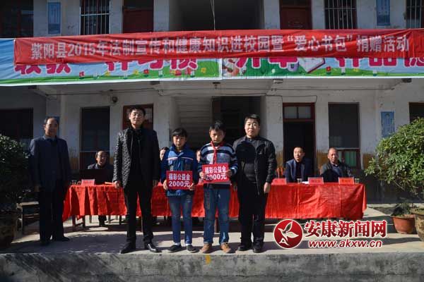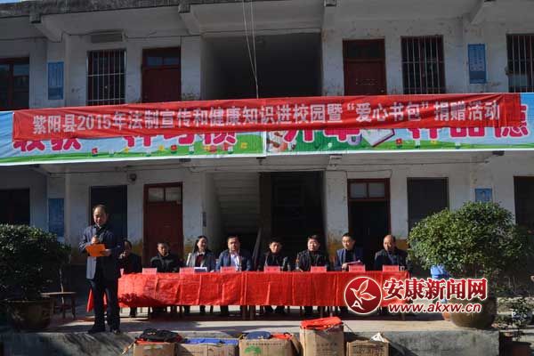 安康新聞網(wǎng)訊 (通訊員 肖寶) 在“12•4”國家憲法日暨全國法制宣傳日即將到來之際,11月26日,由紫陽團縣委舉辦的紫陽縣2015年法制宣傳和健康知識進校園暨“愛心書包”捐贈活動走進斑桃小河小學(xué);顒蝇F(xiàn)場,紫陽團縣委為全校學(xué)生購買了價值1.5萬元的愛心書包和手套,并及時發(fā)放到了每個學(xué)生的手中。