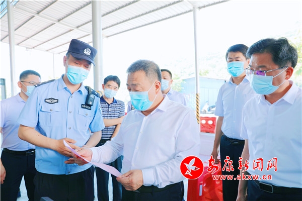在城關(guān)鎮(zhèn)下卡子省際疫情防控卡點(diǎn),武文罡詳細(xì)了解防控流程、交通查驗(yàn)等情況,對(duì)堅(jiān)守一線的防疫人員表示慰問(wèn)和感謝。他強(qiáng)調(diào),當(dāng)前我市疫情防控工作總體平穩(wěn),但國(guó)內(nèi)疫情形勢(shì)依然嚴(yán)峻復(fù)雜,要緊繃思想之弦,杜絕麻痹大意,加強(qiáng)值班值守,耐心細(xì)致做好來(lái)返人員掃碼登記、驗(yàn)碼測(cè)溫、48小時(shí)內(nèi)核酸檢測(cè)陰性證明查驗(yàn)、風(fēng)險(xiǎn)人員“點(diǎn)對(duì)點(diǎn)”轉(zhuǎn)運(yùn)等工作,堅(jiān)決守住外防輸入第一道關(guān)口。在下卡子省際水質(zhì)監(jiān)測(cè)站,武文罡強(qiáng)調(diào),要采取有力舉措加強(qiáng)流域綜合治理,強(qiáng)化源頭把控監(jiān)測(cè),確保出陜斷面水質(zhì)持續(xù)向好、穩(wěn)定達(dá)標(biāo)。